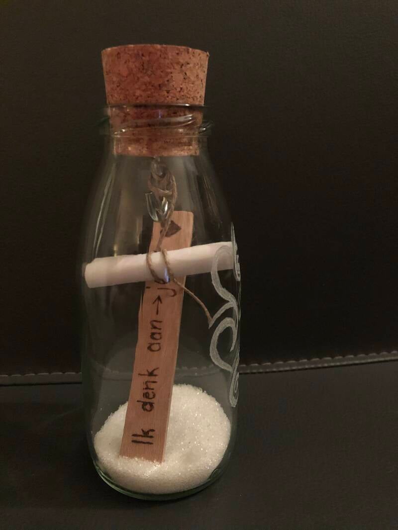 Op een flesje graveer ik voor u een tekst, naam of afbeelding naar keuze. Het flesje wordt geleverd met een grote kurk om deze af te sluiten. In de kurk zit een haak waaraan u (of ik doe dit voor u) een briefje met een wens, gedachte of iets anders vast kunt maken. Ook kunt u er voor kiezen het flesje gevuld met gekleurde snoephartjes of iets anders te ontvangen. Wie geeft u een flesje met geluk? Prijs vanaf €12,00 exclusief verzenden.